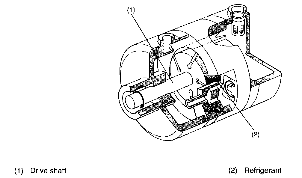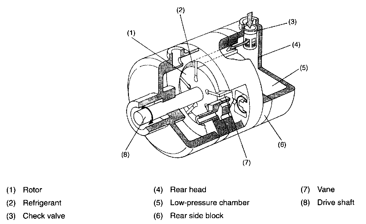 The low-pressure gaseous refrigerant forced out from the evaporator by rotation of the compressor passes from the suction side of the rear head through the check valve and enters the low pressure chamber in the rear head. The gaseous refrigerant is drawn into the cylinder by rotation of the vanes from the two suction ports provided in the side block. Air tightness in the cylinder chamber is maintained by the compressor oil.