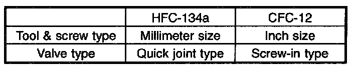In order to help prevent mixing HFC-134a and CFC-12 parts and liquid, the tool and screw type and the type of service valves used are different. The gas leak detectors for the HFC-134a and CFC-12 systems must also not be interchanged.