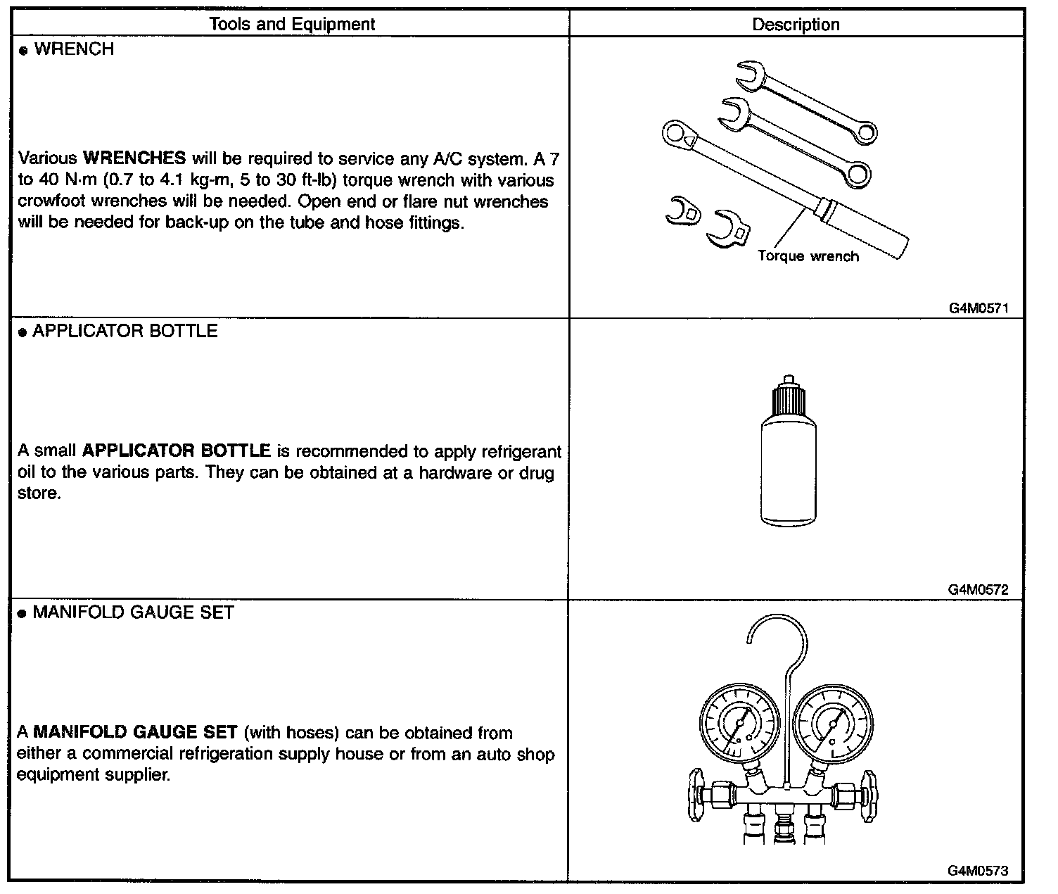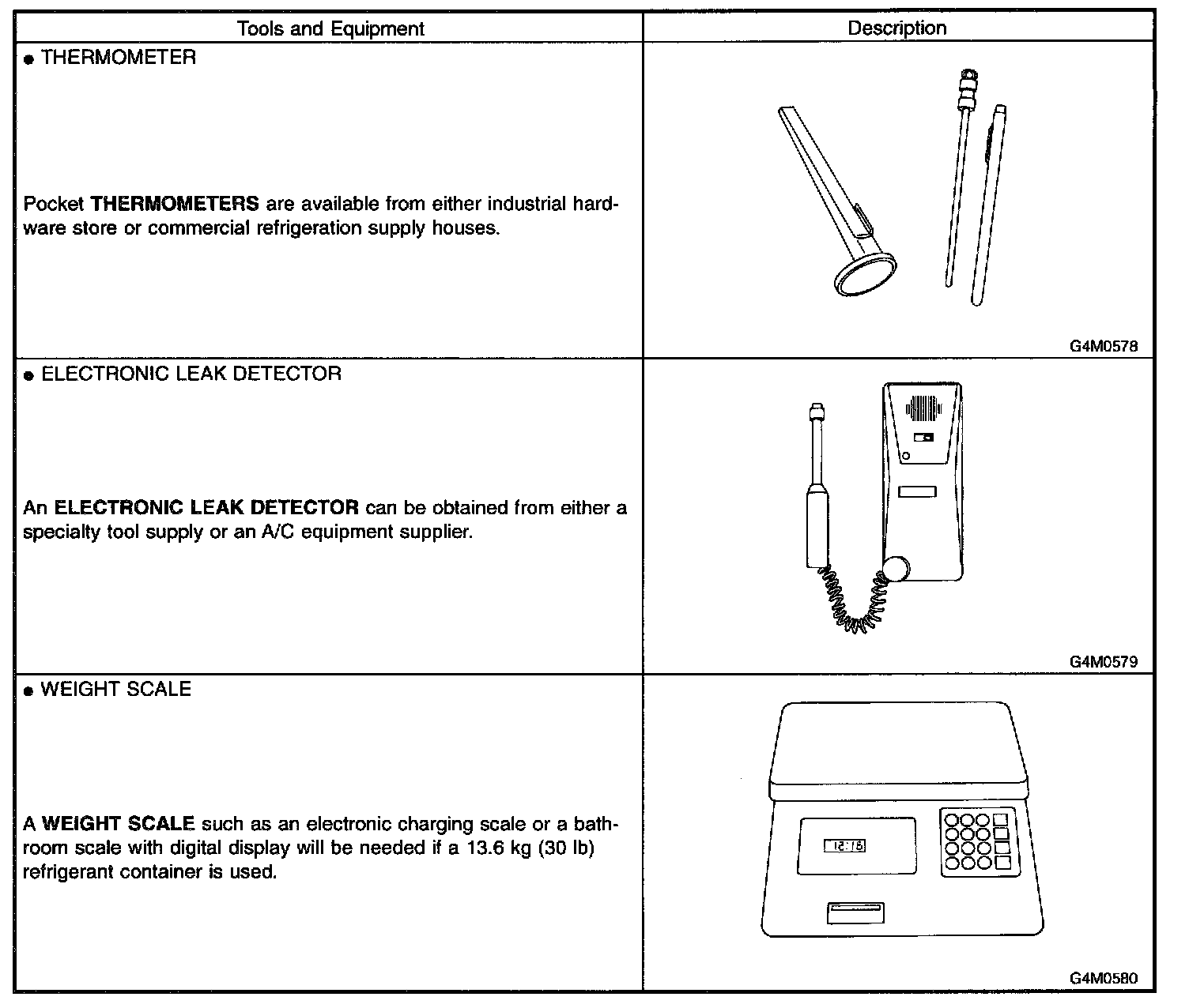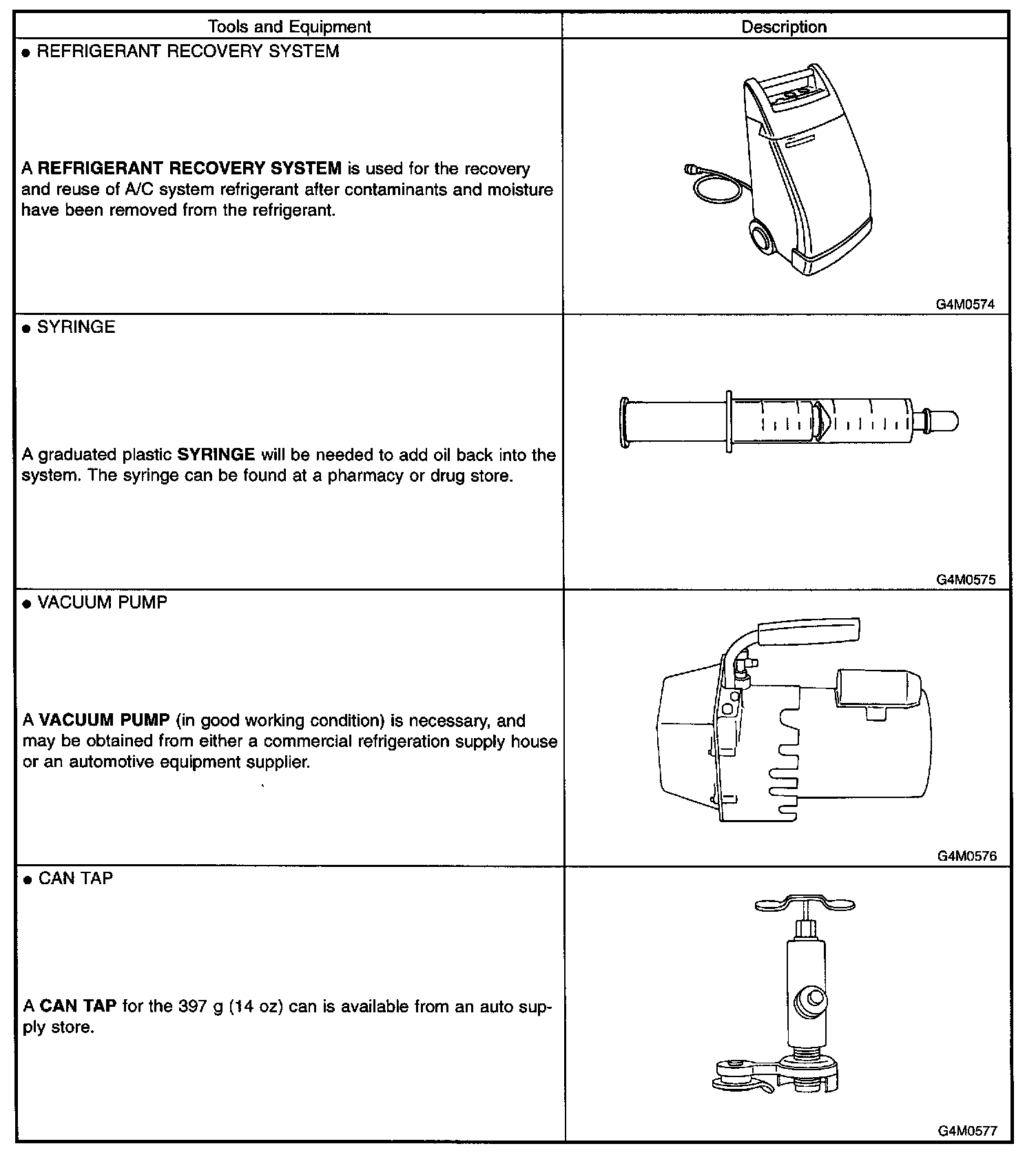 The following section provides information about the tools and equipment that will be necessary to properly service the A/C system.