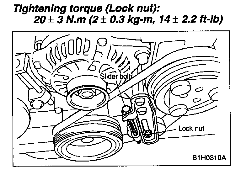 4. Install a new belt, and tighten the slider bolt so as to obtain the specified belt tension.
