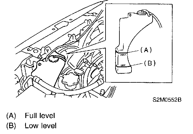 6. If engine coolant level drops from upper level of reservoir tank, add engine coolant to upper level.