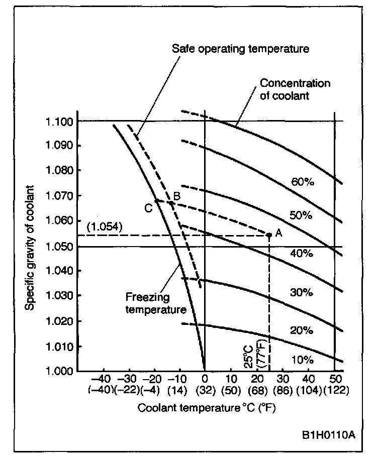 If the coolant temperature is 25 °C (77 °F) and its specific gravity is 1.054, the concentration is 35% (point A), the safe operating temperature is -14 °C (7 °F) (point B), and the freezing temperature is -20 °C (-4 °F) (point C).