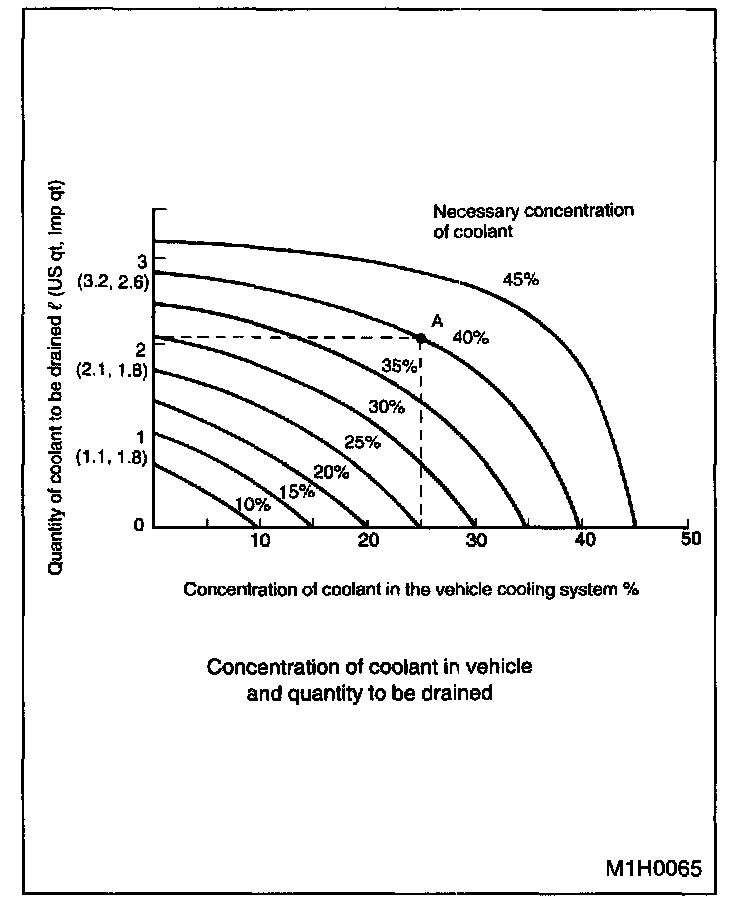Assume that the coolant concentration must be increased from 25% to 40%. Find point A, where the 25% line of coolant concentration intersects with the 40% curve of the necessary coolant concentration, and read the scale on the vertical axis of the graph at height A. The quantity of coolant to be drained is 2.1 liters (2.2 US qt, 1.8 Imp qt). Drain 2.1 liters (2.2 US qt, 1.8 Imp qt) of coolant from the cooling system and add 2.1 liters (2.2 US qt, 1.8 Imp qt) of the undiluted solution of SUBARU coolant.