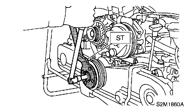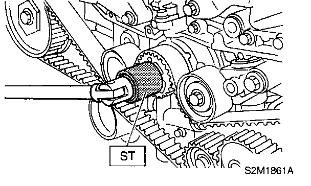 3. Remove crankshaft pulley bolt. To lock crankshaft, use ST.