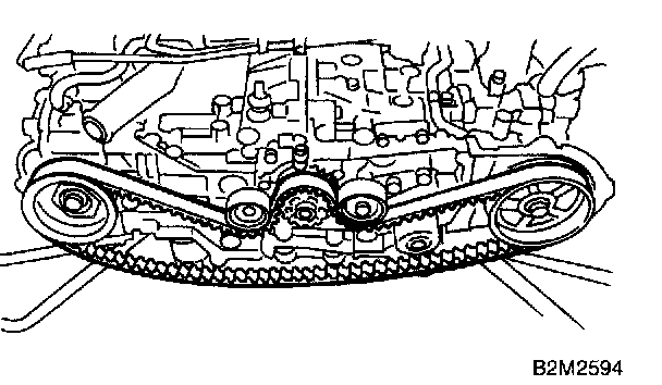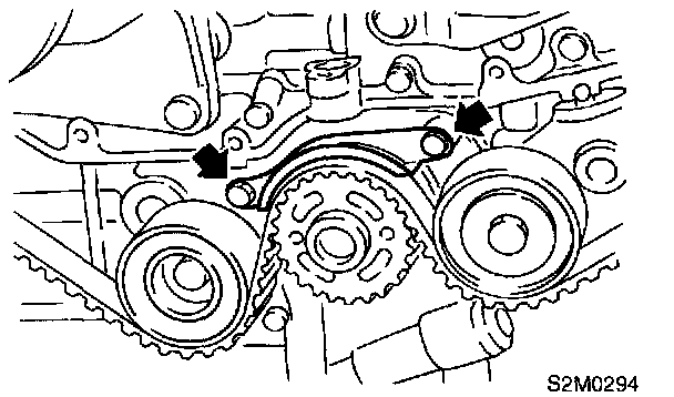 2. Using white paint, put alignment and/or arrow marks on timing belts in relation to the crank sprocket and cam sprockets.