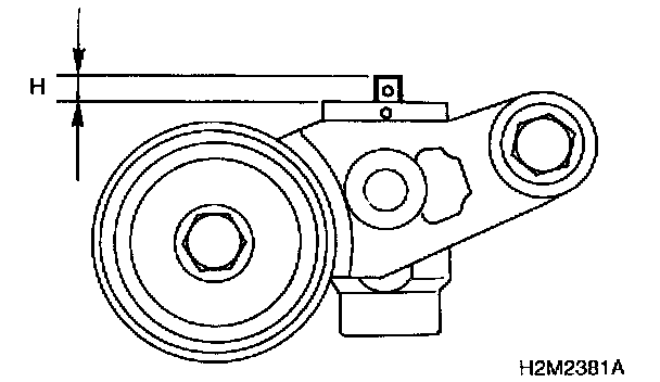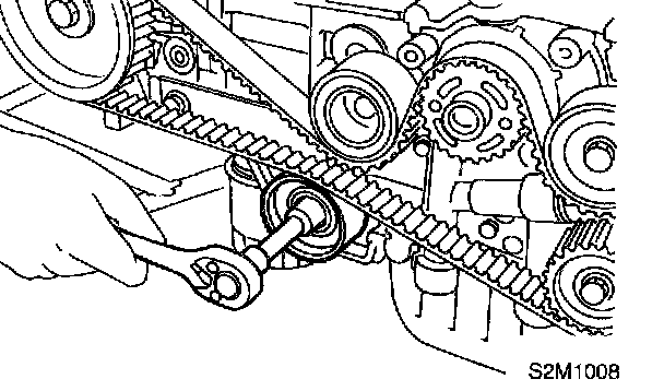 4. After ensuring that the marks on timing belt and camshaft sprockets are aligned, remove stopper pin from belt tensioner adjuster.