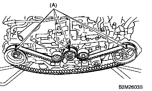 2. While aligning alignment mark (A) on timing belt with marks on sprockets, position timing belt properly.