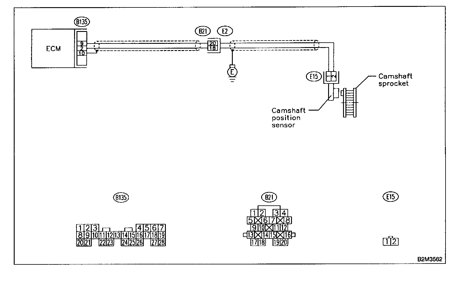 - Open circuit in harness between camshaft position sensor and ECM connector