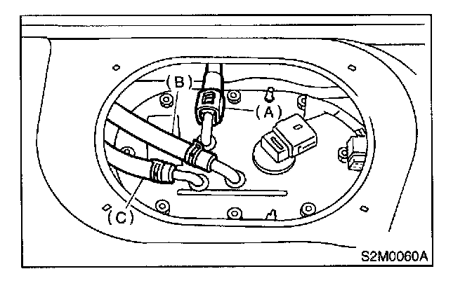 7. Move clips, and then disconnect fuel delivery hose (A), return hose (B) and jet pump hose (C).