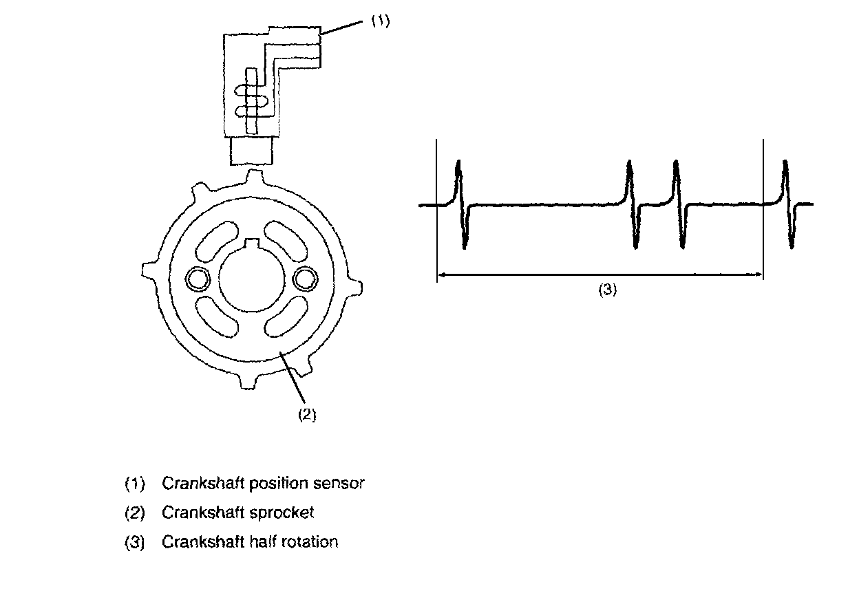 - The crankshaft position sensor is installed on the oil pump, located in the front center portion of the cylinder block, to detect the crankshaft position. It is designed so that the ECM accurately reads the number of pulses which occur when protrusions provided at the perimeter of the crankshaft sprocket (rotating together with the crankshaft) cross the crankshaft position sensor.