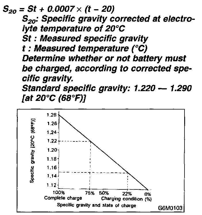 1. Measure specific gravity of electrolyte using a hydrometer and a thermometer. Specific gravity varies with temperature of electrolyte so that it must be corrected at 20 °C (68 °F) using the following equation: