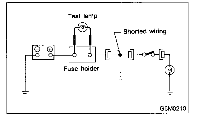 Connect a test lamp (rated at approximately 3 watts) in place of the blown fuse and allow current to flow through the circuit. Disconnect one connector at a time from the circuit, starting with the one located farthest from the power supply. If the test lamp goes out when a connector is disconnected, the wiring between that connection and the next connector (farther from the power supply) is shorted.