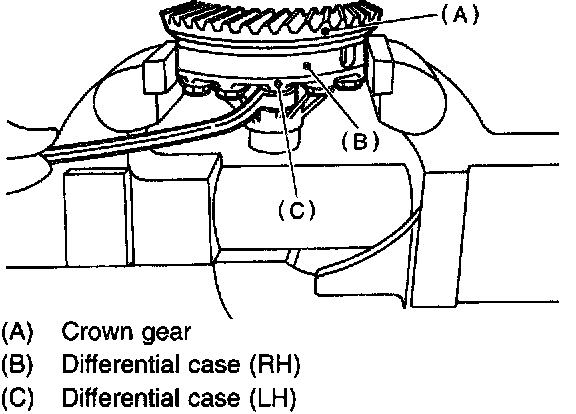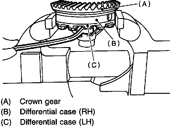 2. Install the washer and differential bevel gear to the differential case (LH). Then put the case over the differential case (RH), and connect both cases.