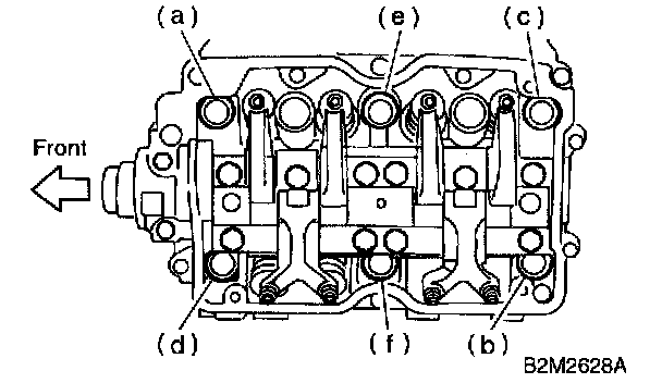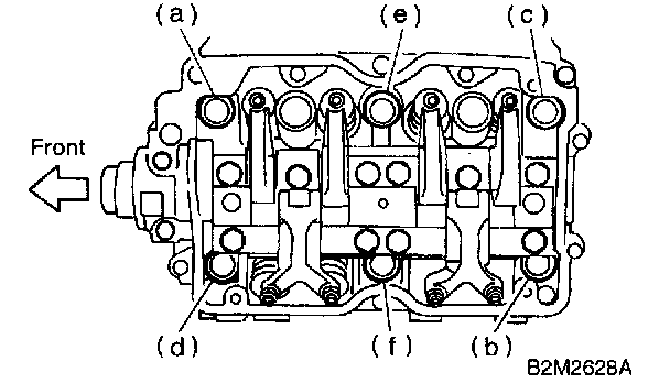 CAUTION: Leave bolts (a) and (c) engaged by three or four threads to prevent cylinder head from falling.