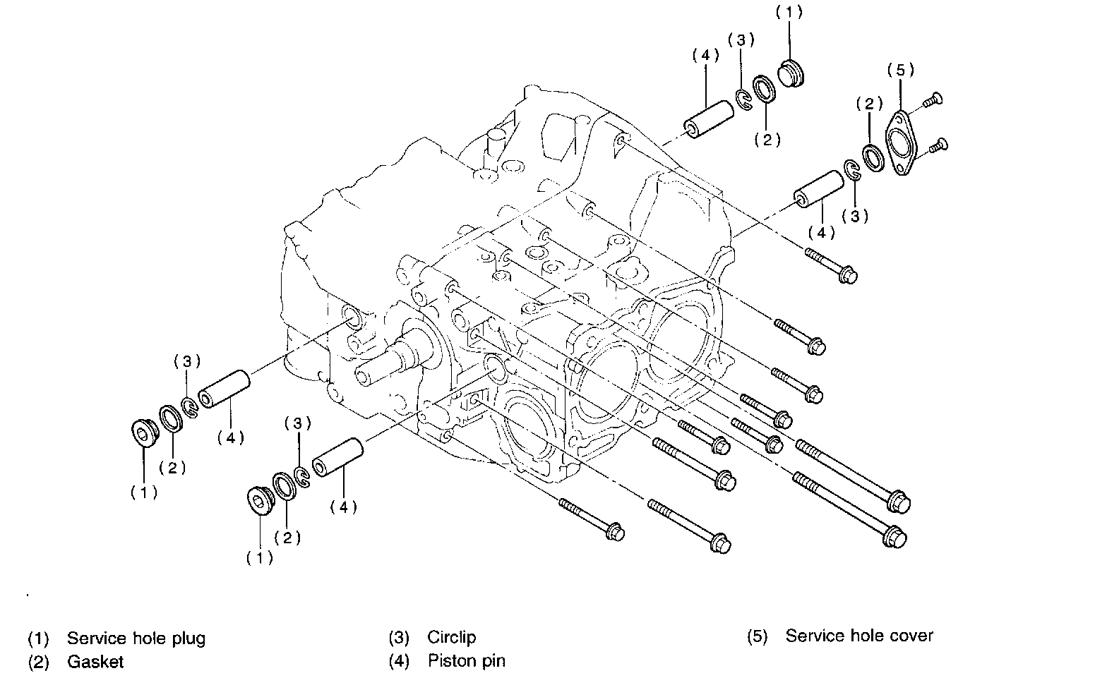 2. Rotate crankshaft to bring #1 and #2 pistons to bottom dead center position, then remove piston circlip through service hole of #1 and #2 cylinders.