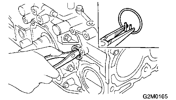 16. Remove oil pump from cylinder block. Use a flat-bladed screwdriver as shown in figure when removing oil pump.