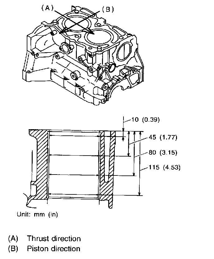 Measure the inner diameter of each cylinder in both the thrust and piston pin directions at the heights shown in the figure, using a cylinder bore gauge.