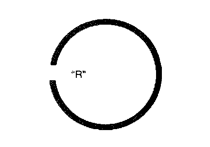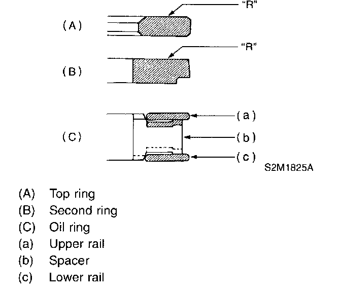 ^ "R" is marked on the end of the top and second rings. When installing the rings to the piston, face this mark upward.