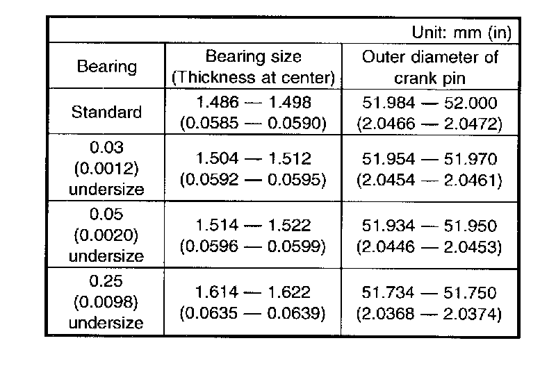 5. Measure the oil clearance on individual connecting rod bearings by means of plastigauge. If any oil clearance is not within specification, replace the defective bearing with a new one of standard size or undersize as necessary. (See the table.)