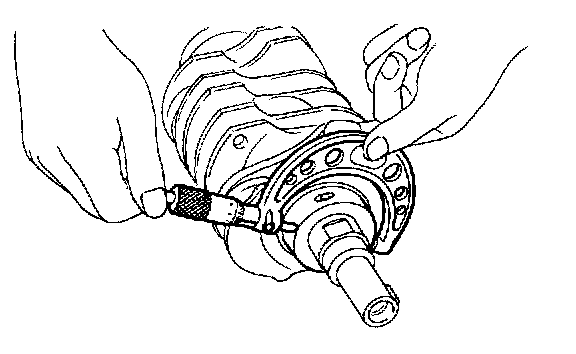3. Inspect the crank journal and crank pin for wear. If they are not within the specifications, replace bearing with a suitable (undersize) one, and replace or recondition crankshaft as necessary. When grinding crank journal or crank pin, finish them to the specified dimensions according to the undersize bearing to be used.