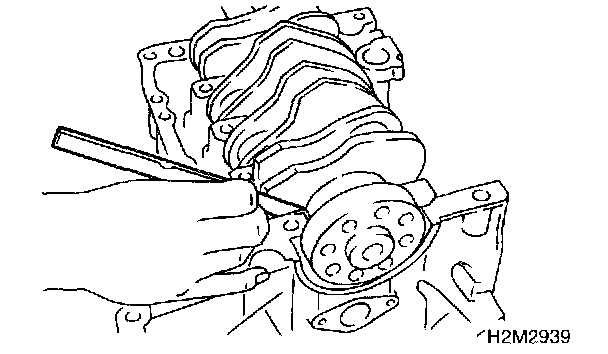 4. Measure the thrust clearance of crankshaft at center bearing. If the clearance exceeds the limit, replace bearing.