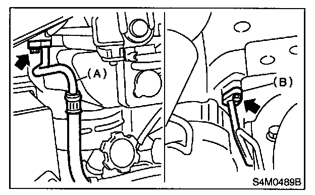 4. Disconnect high-pressure hose (A) and high-pressure pipe (B) from condenser.