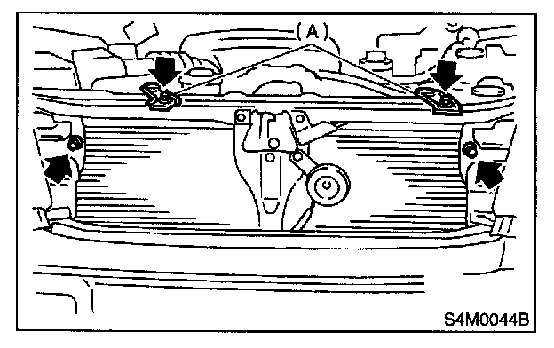 5. Remove the radiator bracket (A) and then remove the two bolts which secure condenser. While lifting condenser, remove it through space between radiator and radiator panel.