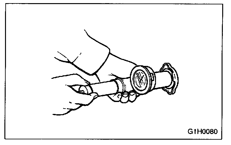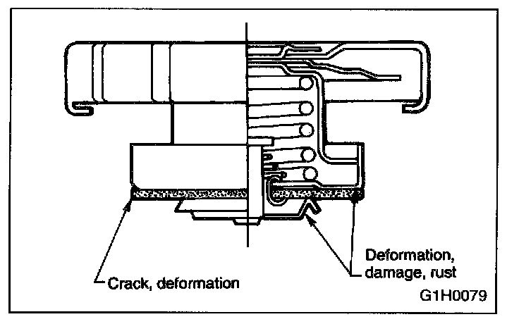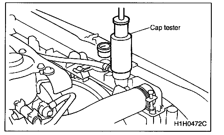 1. Check radiator for leakage, filling it with coolant and attach radiator cap tester to the filler neck. Then apply a pressure of 457 kPa (1.6 kg/sq.cm, 23 psi) and check the following points: