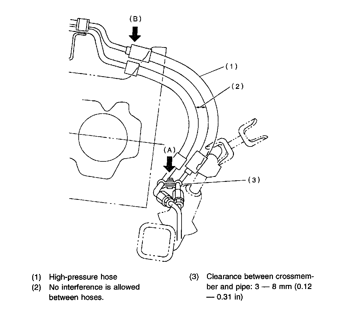 2. Check that clearance between cruise control pump and power steering hose is at least 10 mm (0.39 inch). If it is not, bend section (B) down until a clearance of at least 10 mm (0.39 inch) is obtained.