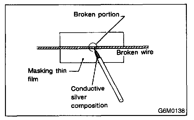 3. Place the slit on glass along the broken wire, and deposit conductive silver composition (DUPONT No.4817) on the broken portion.
