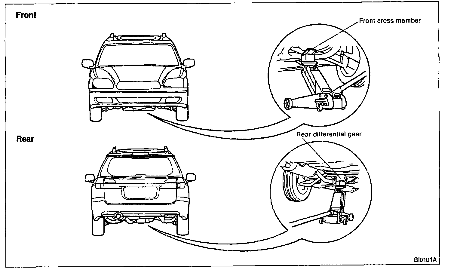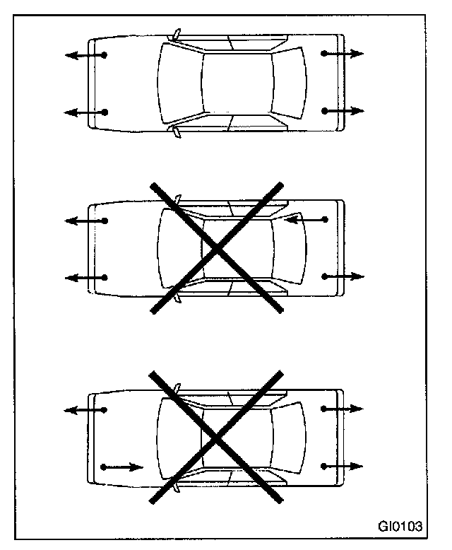 When using a lift or jack-ridged rack to raise a vehicle, always follow Instructions concerning jack-up points and weight limits to prevent the vehicle from falling, which could result in injury. Be especially careful to make sure the vehicle is balanced before raising it.