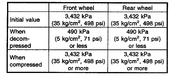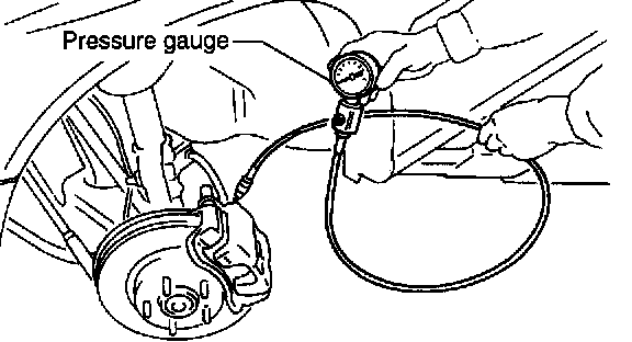7. Read values indicated on the pressure gauge and check if the fluctuation of the values between decompression and compression meets the standard values. Also check if any irregular brake pedal tightness is felt.