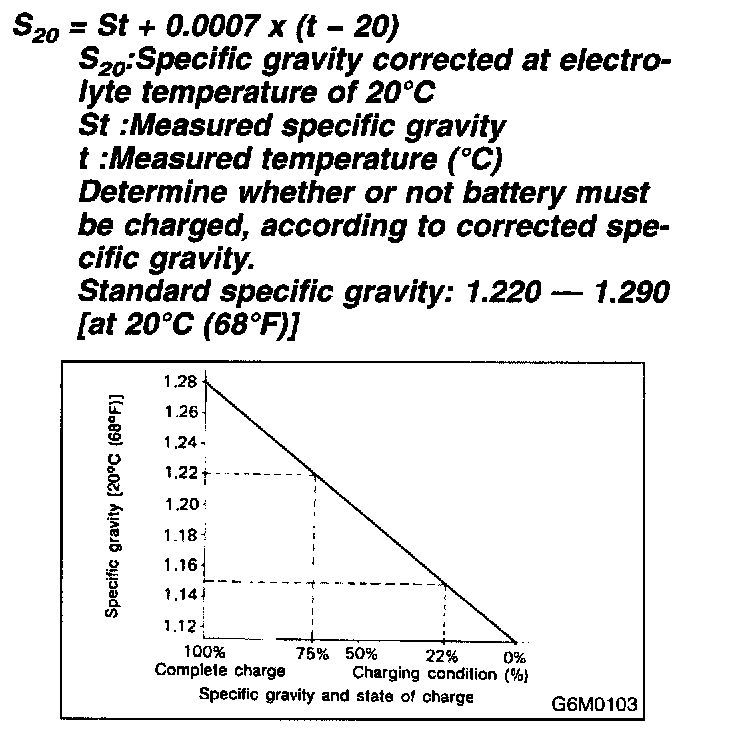 1. Measure specific gravity of electrolyte using a hydrometer and a thermometer. Specific gravity varies with temperature of electrolyte so that it must be corrected at 20 °C (68 °F).using the following Equation: