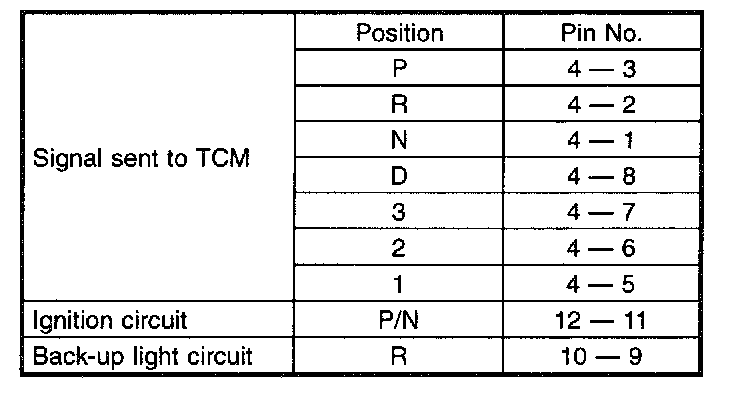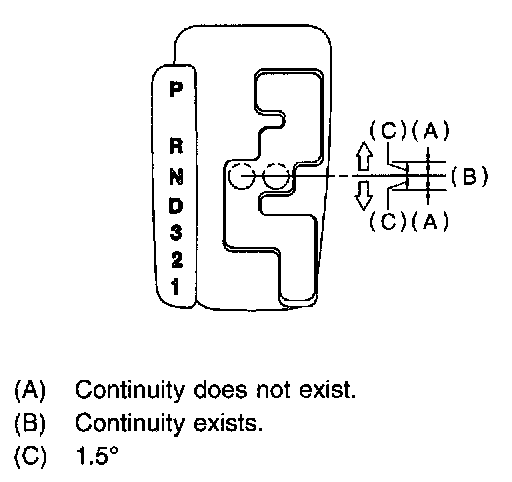 CAUTION: Also check that continuity in ignition circuit does not exist when select lever is in R, D, 3, 2 and 1 ranges.