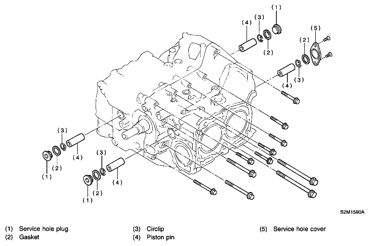 28. Rotate crankshaft to bring #1 and #2 pistons to bottom dead center position, then remove piston circlip through service hole of #1 and #2 cylinders.