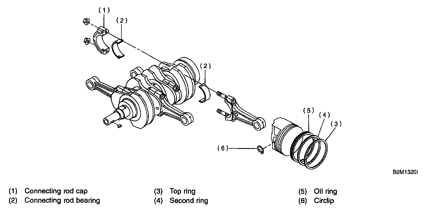 1. If piston ring is broken, damaged, or worn, or if its tension is insufficient, or when the piston is replaced, replace piston ring with a new one of the same size as the piston.