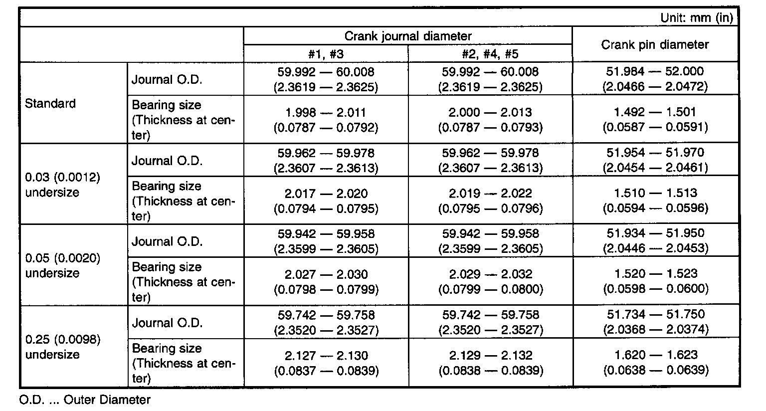 3. Inspect the crank journal and crank pin for wear. If they are not within the specifications, replace bearing with a suitable (undersize) one, and replace or recondition crankshaft as necessary. When grinding crank journal or crank pin, finish them to the specified dimensions according to the undersize bearing to be used.