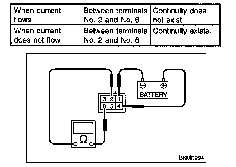 Check continuity between the security horn relay terminals (indicated in the table) when connecting the battery to terminals No.1 and No.4.