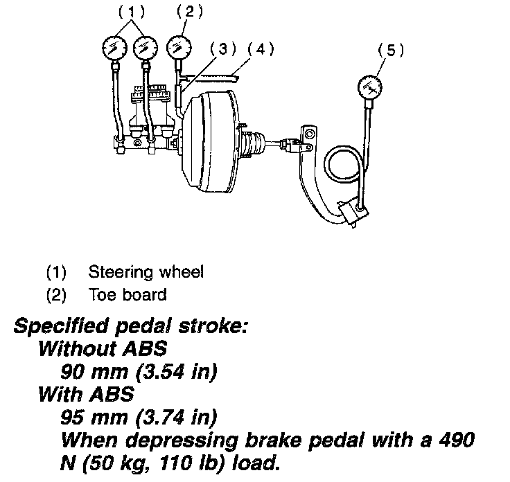 While the engine is idling, depress the brake pedal with a 490 N (50 kg, 110 lbs.) load and measure the distance between the brake pedal and steering wheel. With the brake pedal released, measure the distance between the pedal and steering wheel again. The difference between the two measurements must be more than specified.