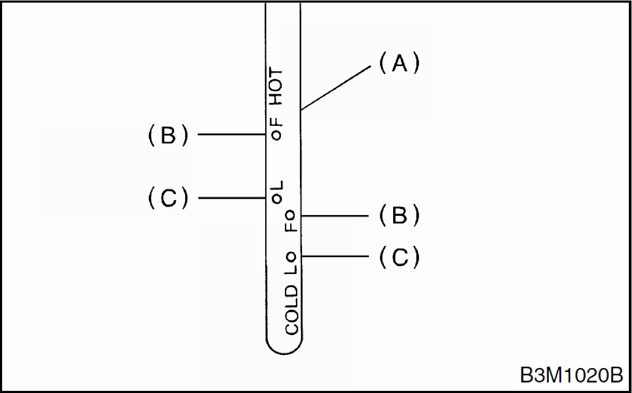 (3) If the fluid level is below the center between upper and lower marks, add the recommended ATF until the fluid level is found within the specified range (above the center between upper and lower marks). When the transmission is hot, the level should be above the center of upper and lower marks, and when it is cold, the level should be found below the center of these two marks.
