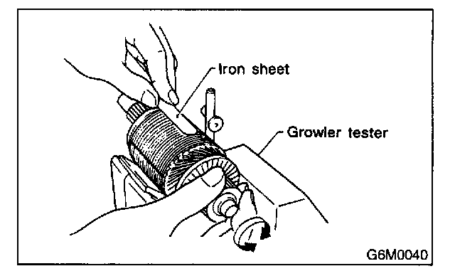 Check armature for short-circuit by placing it on growler tester. Hold a hacksaw blade against armature core while slowly rotating armature. A short-circuited armature will cause the blade to vibrate and to be attracted to core. If the hacksaw blade is attracted or vibrates, the armature, which is short-circuited, must be replaced or repaired.