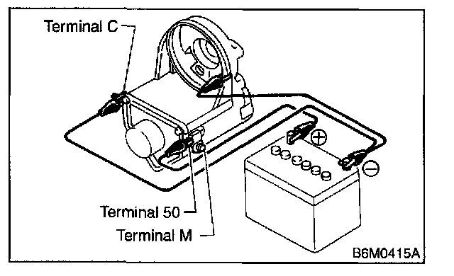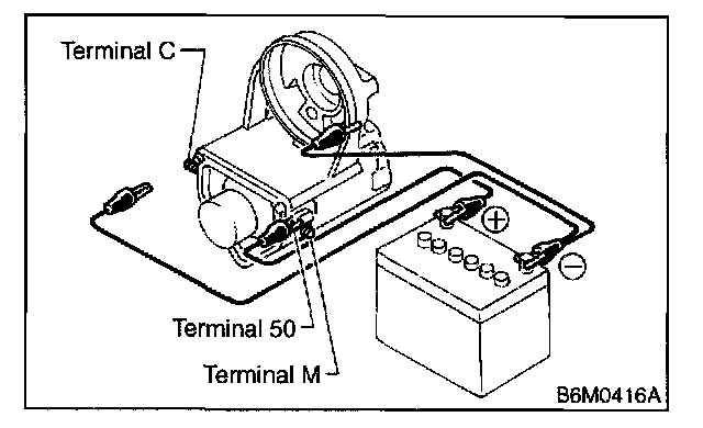 Connect two battery negative leads onto terminal 50 and onto switch body respectively. Then connect battery positive lead onto terminal C. Next, disconnect lead from terminal 50. Pinion should return immediately.