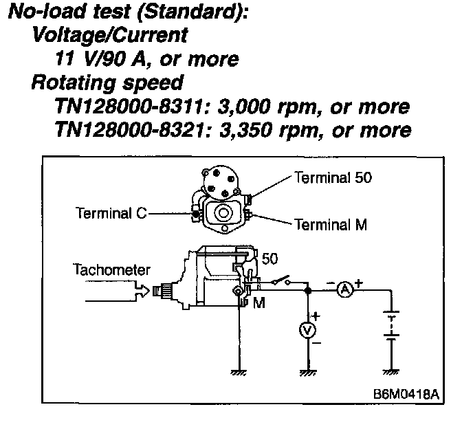 Run single starter under no-load state, and measure its rotating speed, voltage, and current, using the specified battery. Measured values must meet the following standards: