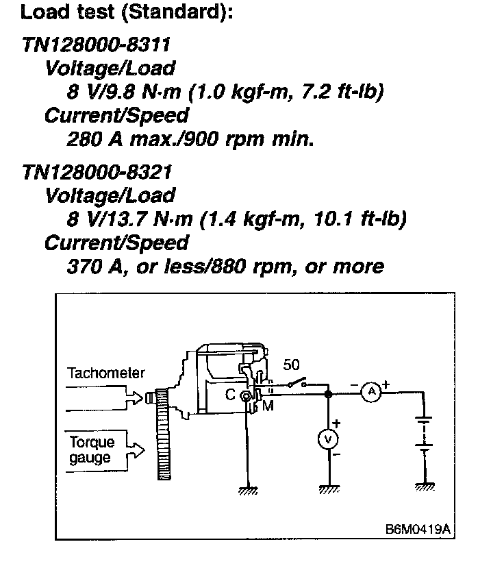 Perform this test to check maximum output of starter. Use test bench which is able to apply load (brake) to starter. Measure torque value and rotating speed under the specified voltage and current conditions while controlling braking force applied to starter.