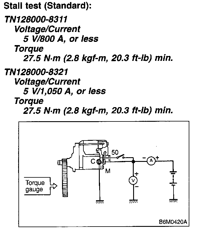NOTE: Low rotating speed or excessive current during no- load test may be attributable to high rotating resistance of starter due to improper assembling. Small current and no torque during stall test may be attributable to excessive contact resistance between brush and commutator; whereas, normal current and insufficient torque may be attributable to shorted commutator or poor insulation. Starter can be considered normal if it passes no load and stall tests; therefore, load test may be omitted.