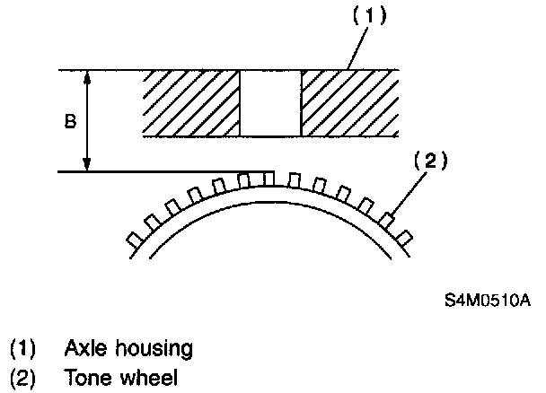 2. Measure the distance "B" between surface where the front axle housing meets the ABS sensor, and the tone wheel.