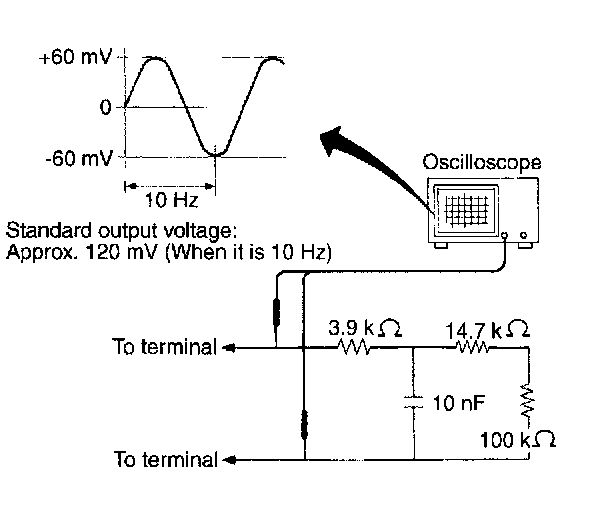 Output voltage can be checked by the following method. Install resistor and condenser, then rotate wheel about 2.75 km/h (2 MPH) or equivalent.