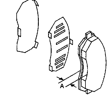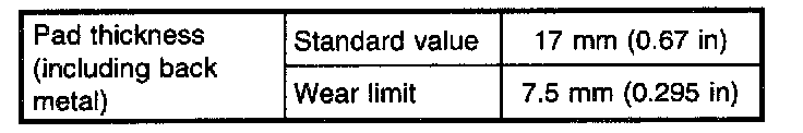 ^ A wear indicator is provided on the inner disc brake pad. If the pad wears down to such an extent that the end of the wear indicator contacts the disc rotor, a squeaking sound is produced as the wheel rotates. If this sound is heard, replace the pad.