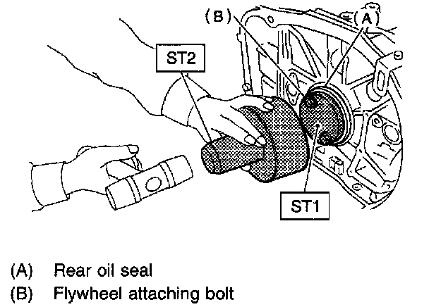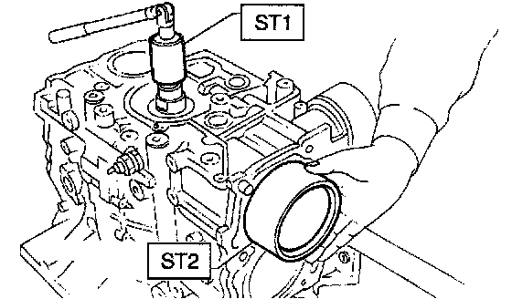 16) Remove flywheel (MT vehicles only) or drive plate (AT vehicles only). Using ST, lock crankshaft. ST 498497100 CRANKSHAFT STOPPER