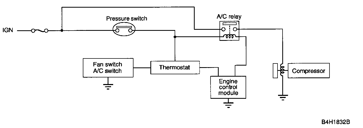 When the A/C switch and fan switch are turned ON, a signal is sent to the engine control module. The engine control module then judges whether the engine is in operation. If the engine is operating, the engine control module activates the A/C relay. The maximum clutch "ON" delay times is 0.8 seconds after the A/C relay is activated.